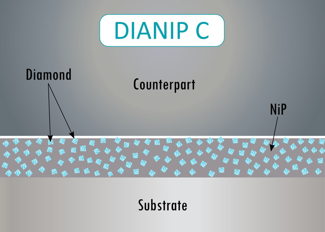 金剛石涂層是由單晶金剛石和化學(xué)鎳基體組成,DIANIP涂層嵌入的金剛石顆粒尺寸非常均勻一致。涂層功能性主要取決于嵌入涂層金剛石顆粒的尺寸。涂層功能主要體現(xiàn): 硬度、磨損性能、摩擦性能、配合性、尖銳化。單晶金剛石顆粒尺寸的完美選擇和定義使得涂層表面形貌非常規(guī)則,涂層定義明確化。共沉積和涂層是通過(guò)化學(xué)方法進(jìn)行,這種方法可以完成完全規(guī)則厚度的表面涂層,而不受基體邊緣尺寸的影響,并且在復(fù)雜表面的狹小尺寸處也能完好的進(jìn)行涂層并沉積金剛石顆粒。涂層可以保證金剛石顆粒60%的尺寸嵌入鎳涂層, 金剛石在涂層中牢固錨定。此外,DIANIP技術(shù)還允許在化學(xué)鎳的基體中引入高比重含有小粒徑(約3μm)的金剛石顆粒,生產(chǎn)出極為耐磨的復(fù)合涂層